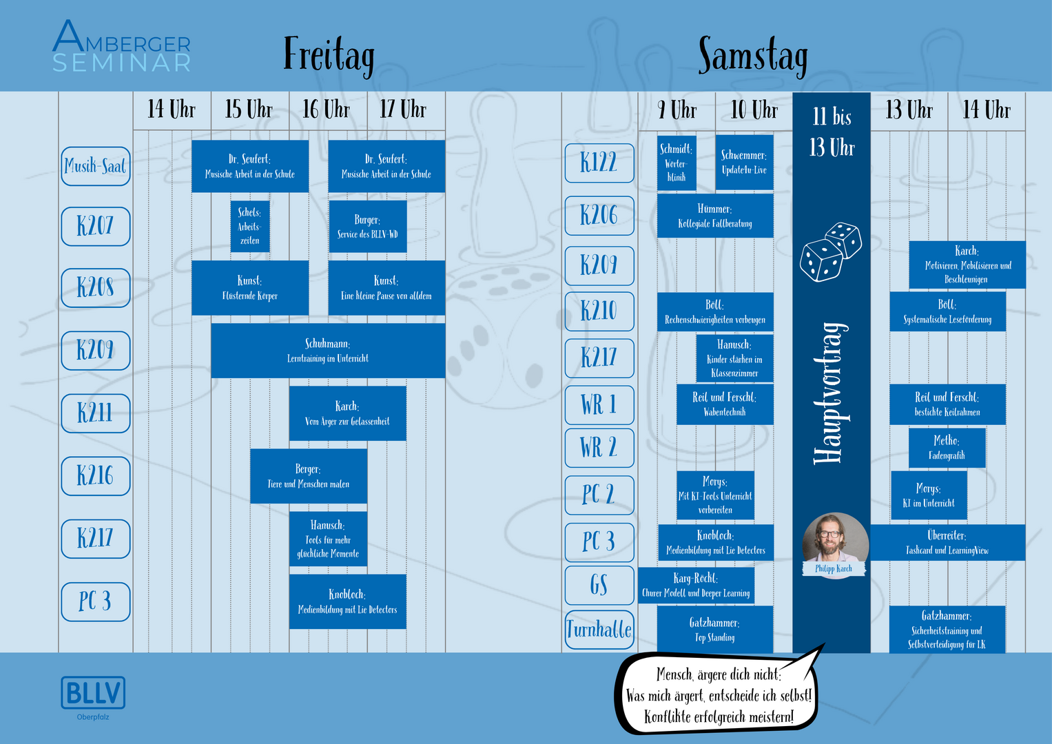 Für das 62. Amberger Seminar konnte Philipp Karch als Hauptreferent gewonnen werden. Philipp Karch ist Coach, Trainer und Speaker für Ärger-Minimierung, Humanismus und Eloquenz. Nachdem er Landschaftsökologie in Münster und Environmental Studies in Los Angeles studiert hat, war er als Verlagsredakteur, Politikberater eines Wirtschaftsverbandes und Projektleiter in Agenturen immer wieder konfrontiert mit der Komplexität von Ärger- und Konfliktdynamiken sowie dem Wunsch nach mehr Gelassenheit und Souveränität. Seit 2010 leitet Karch Führungskräftetrainings und Seminare, hält Infotainment-Vorträge und bietet Konfliktklärungsgespräche sowie Einzelcoachings an. Seit 2022 gibt es seine Anti-Ärger-App und Online-Kurse für mehr Emotionale Intelligenz und Integrität. Für sein Kernthema „Schwierige Gesprächssituationen meistern“ vermittelt er Schlüsselkompetenzen in den Bereichen Emotionale Kompetenz, Motivation und Feedback.